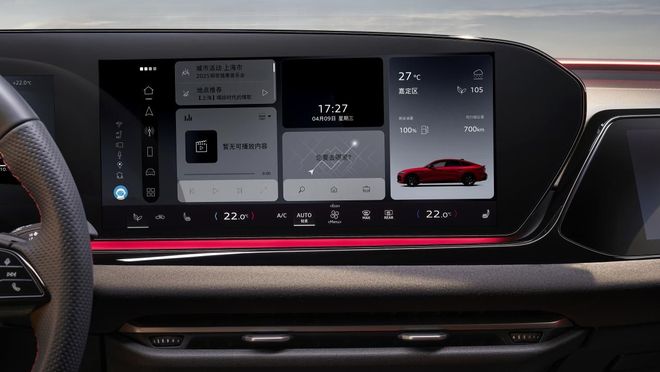 内饰方面,上汽奥迪A5L Sportback打造了全新一代智能座舱。环抱中控搭配3D曲面连屏,其中包括11.9吋的奥迪虚拟驾驶舱(液晶仪表屏)、14.5吋的中控MMI触摸显示屏以及10.9吋的副驾屏,为驾乘人员带来了沉浸式的科技体验。副驾屏不仅提升了副驾乘客的娱乐性,还配备了防窥功能,保障信息安全。